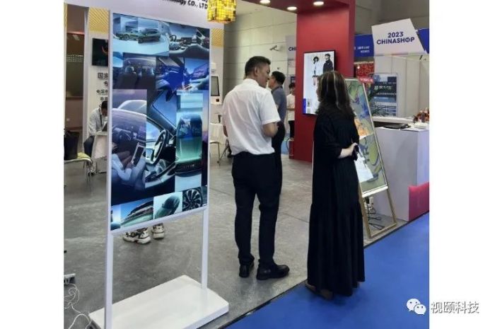 电子水牌视颐主要展示画框款文化水牌和55英寸超薄立式双面屏,前者采用画框钣金氧化工艺,金色边框,看上去非常上档次;55英寸超薄立式双面触摸屏则采用LCD最新技术INCELL方案,整体厚度只有3CM,而且可以触控,不管是技术还是造型,都是广告机的天花板,展会现场颇受青睐,问询者接连不断。