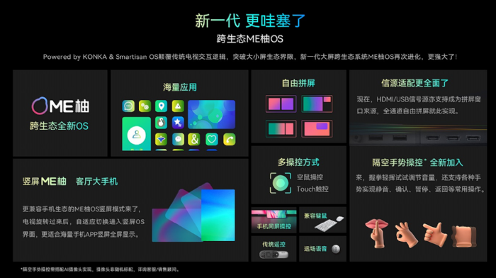 在软件交互系统上,A6 MAX搭载全新大屏软件操作系统ME柚OS,支持自由拼屏、多种操控方式、海量应用等多种功能,满足了当下消费者教育、娱乐、办公等多种场景下的使用需求。拥有多任务管理、多窗口拼接能力,多窗口的视频源支持App应用、手机、电脑的投屏,排布方式也有1:1拼接、大屏拼小屏、横屏拼竖屏、画中画等多种选择,在能实现多窗口播放的前提下,努力保证多任务的流畅性。A6 MAX还支持AI语音、AI摄像头、无线投屏、AI音箱、无线传输支持Wi-Fi 6+、蓝牙等,让AI智慧科技充分融入到我们的生活中来,为我们的大屏娱乐生活丰富多彩。