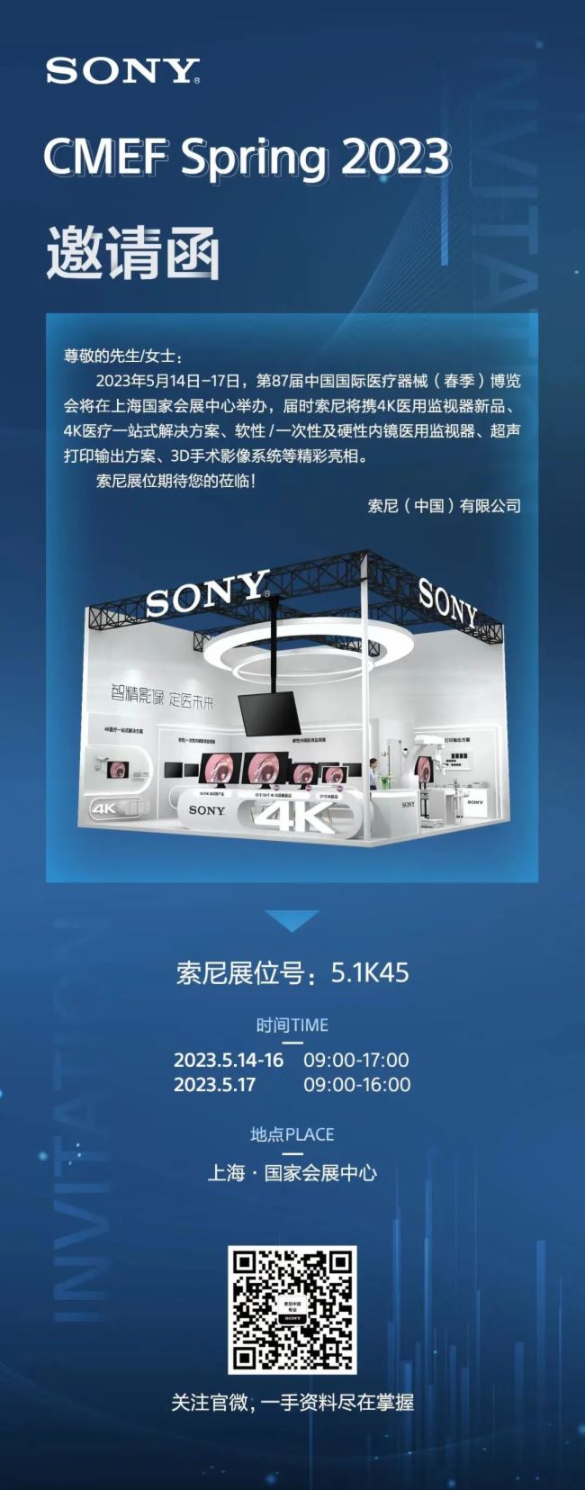2023年5月14日-17日,第87届中国国际医疗器械(春季)博览会将在上海国家会展中心举办,届时索尼将携4K医用监视器新品、4K医疗一站式解决方案、软性 /一次性及硬性内镜医用监视器、超声打印输出方案、3D手术影像系统等精彩亮相。