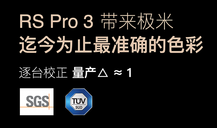 RS Pro 3拥有迄今为止极米产品最高的亮度表现,达到2000CCB 流明(2500CVIA 流明)。其次,极米RS Pro 3 还带来了迄今为止最准确的色彩,具备DCI-P3色域占比>95%,Rec.709色域占比>99.9%的超高色域。但高色域不等同于高色准,如果不做色彩管理,再高的色域也无法忠实还原导演想要的色彩。为此,极米为RS Pro 3定制开发了高色准校正平台,最终实现了量产平均色准△E≈1, 达到可以媲美专业色彩显示器的顶级水平。市面上绝大多数平板电视的色准△E只有2-3,而大多数投影的色准甚至高达6-8。目前,RS Pro 3色准目前已通过瑞士SGS和德国南德两大机构的色准双认证。