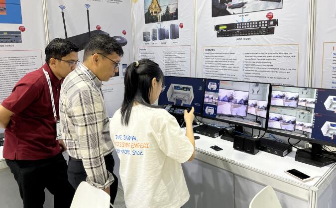 ▲展会现场:为观众讲解分布式网络矩阵系统