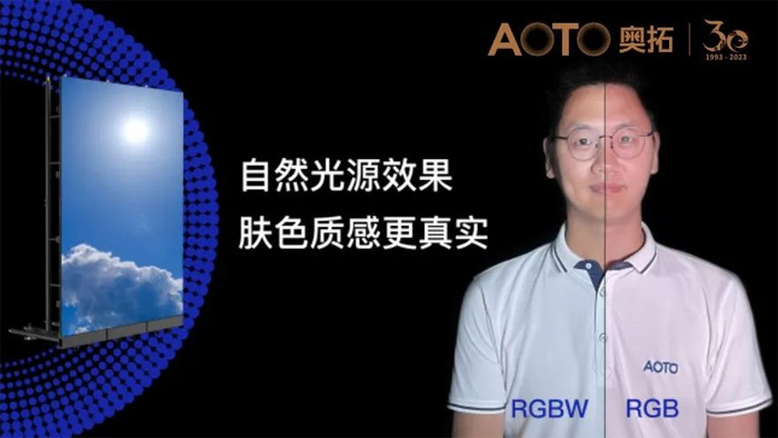普通的RGB LED显示屏在虚拟拍摄中往往不能满足这一需求,因为它们只能显示红绿蓝三种颜色,而不能调节白光的亮度和色温,导致真实场景和虚拟场景的光照条件不一致,影响肤色的还原度和自然感。为了解决这一问题,奥拓电子研发出了SW-RGBW天幕系列显示屏,它采用了特殊的“RGBW-红绿蓝白”技术,可以根据场景的需要,调节白光的亮度和色温,从而实现更精准和更自然的肤色还原,可以实现更自然和真实的肤色还原,CRI和TLCI≥90,提升虚拟拍摄的画面质量和视觉效果。