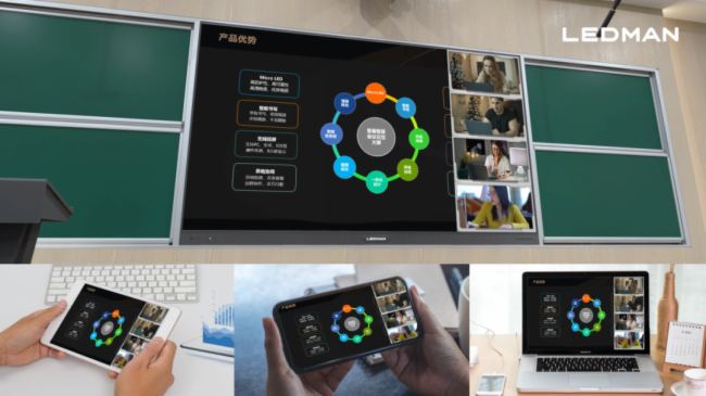 在黑板上书写的内容可实时同屏放大显示,老师也可直接在屏幕上进行批注;可多点触控的Micro LED超高清显示面板,分屏书写,激发学生思考多种解题思路。