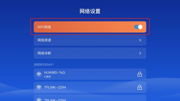 方法二:按压遥控器设置键——弹出设置菜单界面——选择网络——打开WiFi网络——选择你的WiFi网络名称——输入WiFi密码——连接