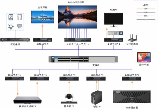 采用网络分布式系统,使用110个分布式节点,满足多个区域的音视频资源互通互联,实现统一管控;同时,可将任意一路信号在任意大屏中调用显示,支持一键共享;