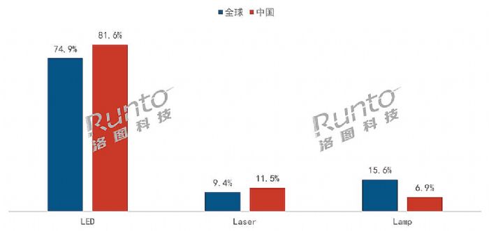 LED灯具备能耗低、寿命长等特点,可以在较小的体积内实现适宜的亮度,因而是主流的光源类型。根据洛图科技(RUNTO)数据显示,2023年上半年,LED光源在全球市场的出货量占比为74.9%,在中国市场的占比则超过八成,达到81.6%。