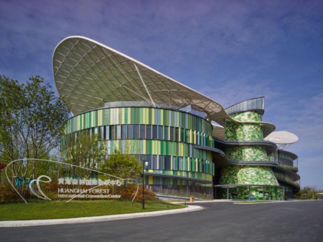 黄海森林公园位于江苏省东台市,由海林片区和海滨片区组成,总面积达到了6.8万亩,是华东地区规模最大的人造生态林园。位于森林公园核心区东侧的黄海森林公园国际会议中心,颜值爆表、气场十足。设计以"飘叶"为主题,呼应黄海森林公园的自然风貌,总建筑面积达到了1.8万平方米。借助系统思维,以会务功能为核心,集合了报告厅、宴会厅、会议室、酒吧、书吧等多种类型场所,将建筑、景观、旅游一体化通盘考虑的整体设计,以此打造高品质、弹性发展的国际化会议综合体,塑造黄海森林公园的自然生态新名片。