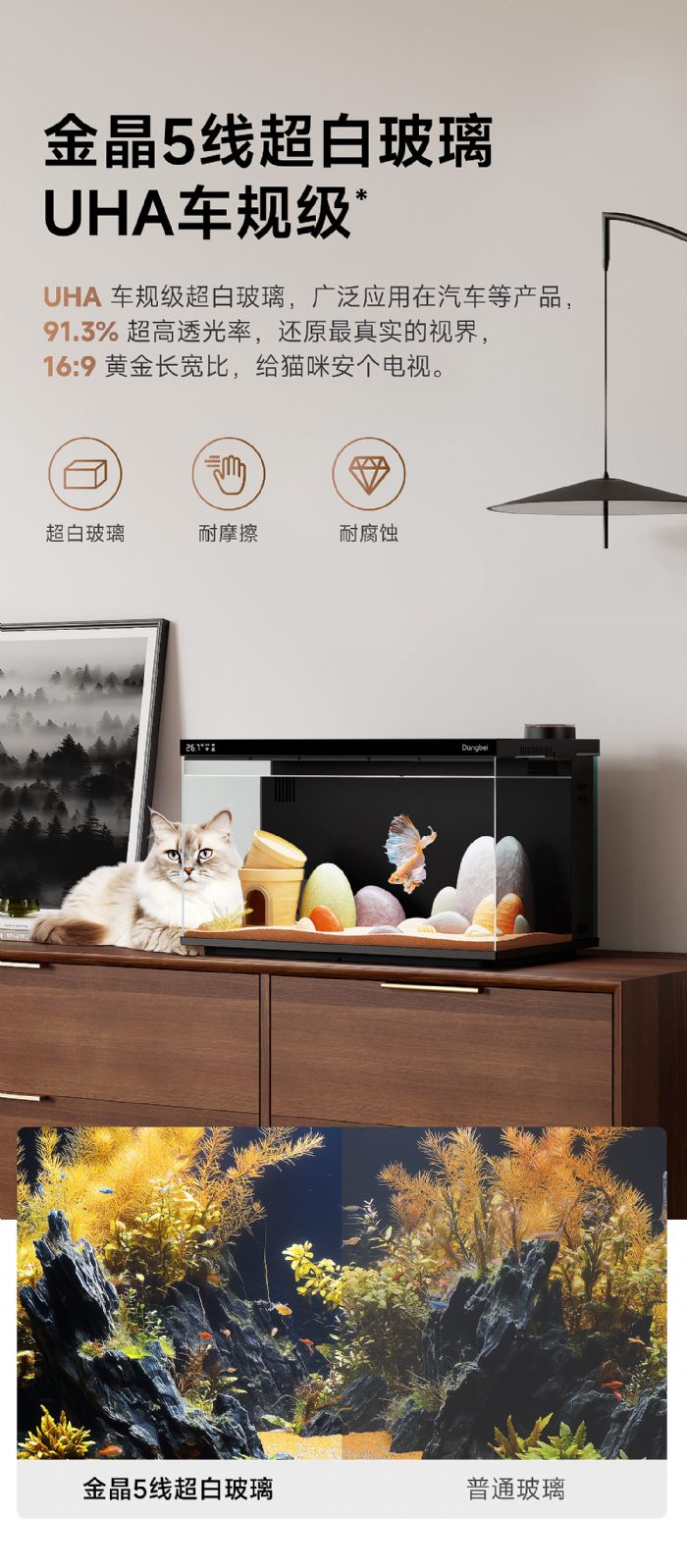 为简化日常维护,当贝智能鱼缸1 Ultra创新性地采用了一键排水与模块化过滤盒设计,无需繁琐的捞鱼或搬动鱼缸,即可轻松完成换水与清洁,让养鱼过程更加卫生且便捷。而选用的UHA车规级金晶5线超白玻璃,透光率高达91.3%,为用户呈现出一个晶莹剔透、色彩还原度极高的观赏世界,每一次凝视都仿佛置身海底奇境。