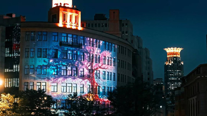 6台巴可43000流明激光投影机UDX-W40照亮这座扇形大楼独特的弧形外墙,让观众从过去光陆大戏院的辉煌岁月穿梭到现代上海的都市繁华。以Rec.709高色域的鲜艳逼真画面效果,展现海派爵士乐等怀旧场景,以及时代发展的美学意境。
