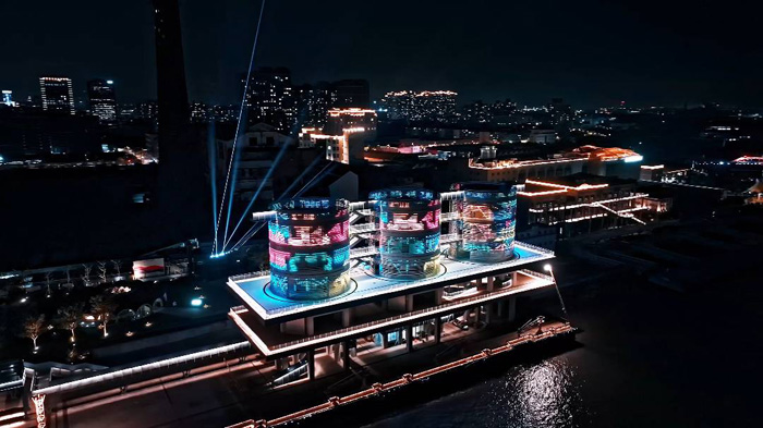 民生路八万吨筒仓的光影秀是一次对工业遗产的致敬。这座承载着浦东工业记忆的建筑,如今摇身一变,成为裸眼3D建筑投影秀的绝美舞台,在光影的编织下,汇聚成一幅幅生动的未来图景。