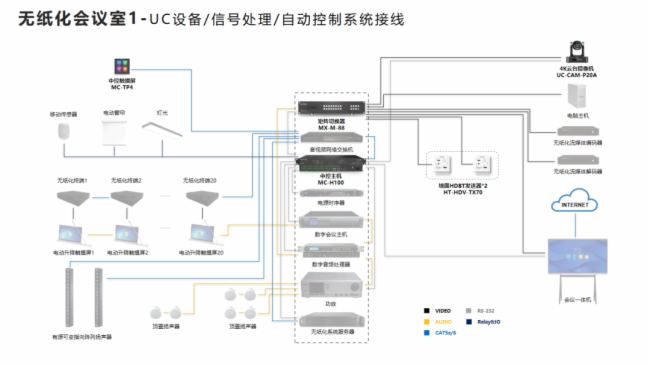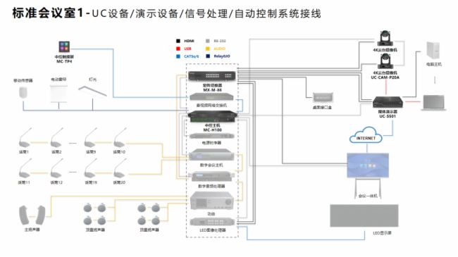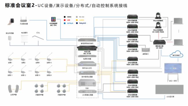 每个会议室我们提供两版信号处理系统 作为参考,分别是矩阵切换器集中信号处理设备和分布式设备 。