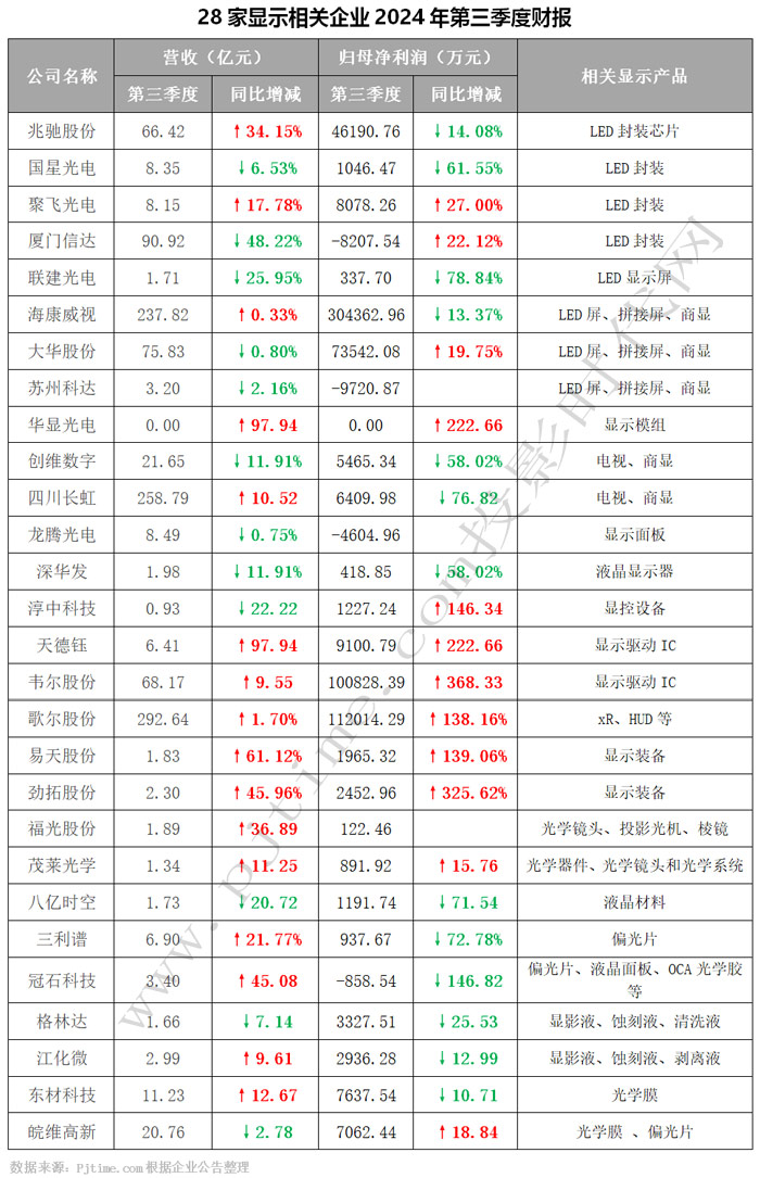 10月25日晚间,兆驰股份、国星光电、聚飞光电、厦门信达、联建光电、海康威视、大华股份、苏州科达、华显光电、创维数字、四川长虹、龙腾光电、深华发、淳中科技、天德钰、韦尔股份、歌尔股份、易天股份、劲拓股份、茂莱光学、八亿时空、三利谱、冠石科技、格林达、江化微、东材科技、皖维高新等28家LED封装、大屏、面板、显示驱动、显示材料与装备等相关显示企业陆续公布2024年第三季度财报。