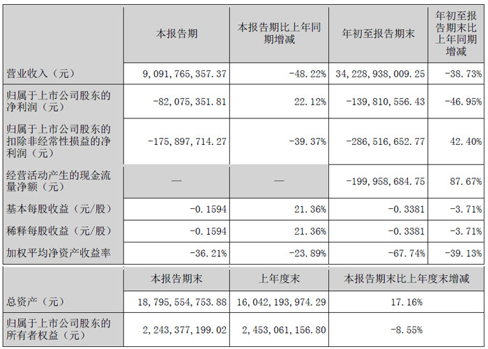 第三季度实现营收90.92亿元,同比下降48.22%;归母净利润-8207.54万元,同比增长22.12%;扣非净利润-1.76亿元,同比下降39.37%。