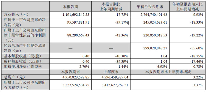 第三季度实现营业总收入11.92亿元,同比下降17.75%;归母净利润9559.79万元,同比下降39.17%;扣非净利润8829.07万元,同比下降42.36%%。