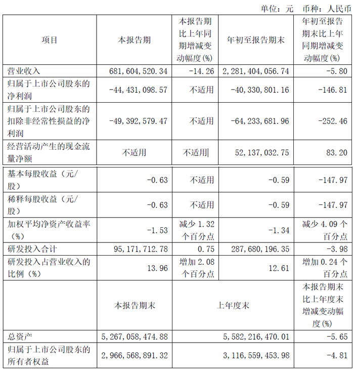 第三季度实现营业总收入6.82亿元;归母净利润-4443.11万元;扣非净利润-4939.26万元。研发投入9517.17万元,同比增加0.75%,研发投入占营业收入的比例达到13.96%,同比增加2.08个百分点。