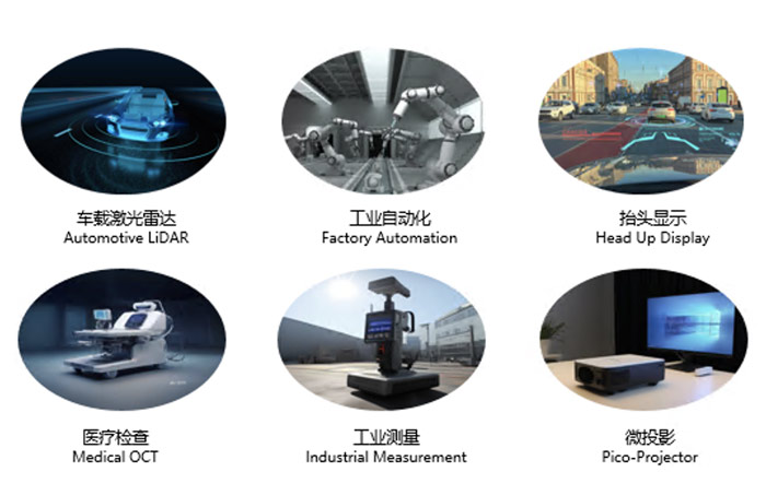 目前研发的二维电磁驱动型MEMS微振镜产品已经有1mm/4mm/8mm规格,该产品具备宽广的光学视场角、体积小、功耗低等特点,已经成功通过汽车可靠性测试,可应用于汽车激光雷达、微投影、AR眼镜、HUD等方向。