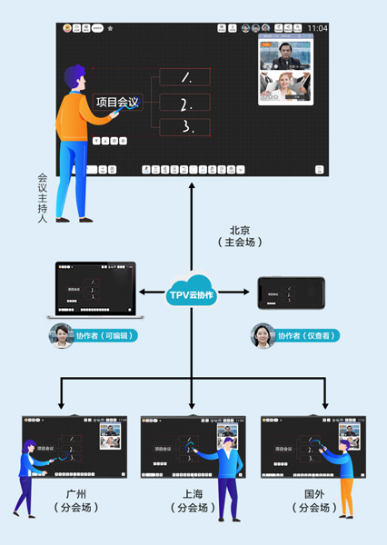 此外,在异地远程视频交互时,会议主持人可跨空间控制多台分会场平板,各会场也可查看、编辑、批注并同步书写,实现跨屏云端交互协同,该功能也为异地会议、异地分享提供更便捷高效的会议沟通途径。会后所有资料都能通过云端保存、共享和异地下载等方式查看,甚至还支持U盘、扫码(可加密)、邮件、云端和直接打印等方式,充分实现会议内容云保存、云下载。