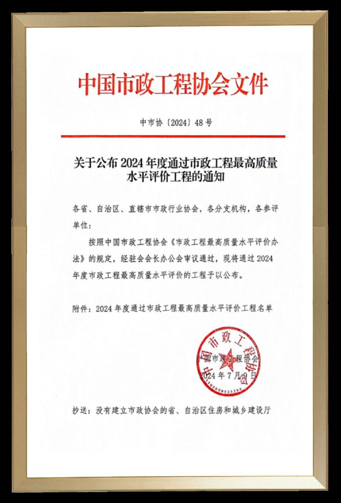 24年7月,中国市政工程协会公布“2024年度通过市政工程最高质量水平评价工程名单”。