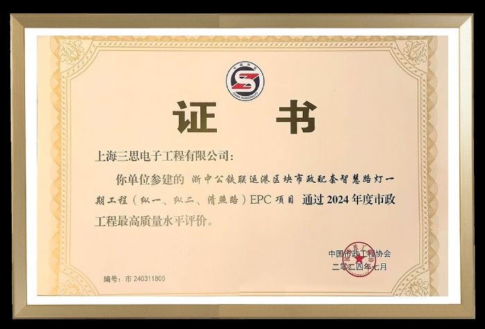 由三思提供照明产品的浙中公铁联运港区块市政配套智慧路灯一期工程(纵一、纵二、清照路)EPC 项目、苏州城北路(长浒大桥-娄江快速路段) 改建工程、上海北横通道新建工程(西段)及龙东大道 (罗山路~G1501) 改建工程均荣获“2024年度市政工程最高质量水平评价”。