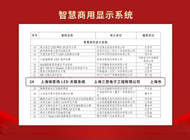 在众多申报项目中,上海三思电子工程有限公司的“上海体育场LED天幕系统”凭借其卓越的技术创新、出色的应用效果以及对视听产业发展的重要推动作用,成功入选本次典型案例名单。该项目不仅展示了LED天幕技术在大型体育场馆中的创新应用,还彰显了三思在视听系统领域的自主研发能力和技术实力。