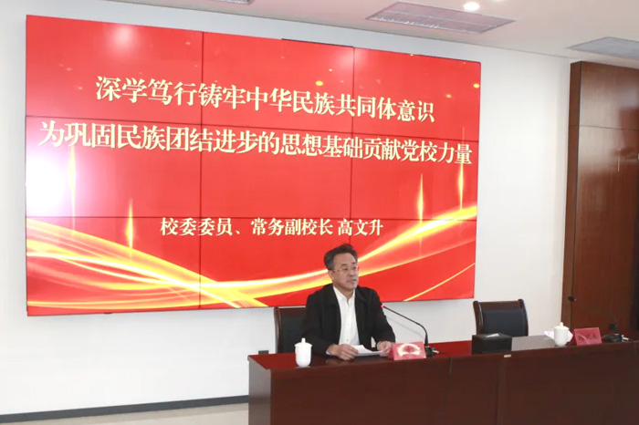 11月13日下午,校委委员、常务副校长高文升为全体教职工讲授《深学笃行铸牢中华民族共同体意识为巩固民族团结进步的思想基础贡献党校力量》专题党课。
