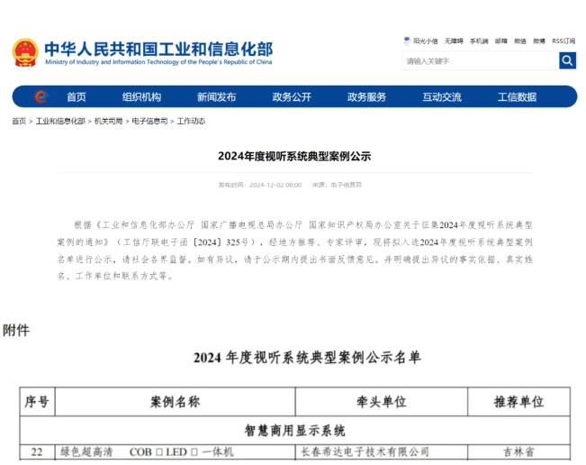 近日,希达电子绿色超高清COB LED 智慧一体机凭借其技术实力与创新风范,成功入选由国家工业和信息化部、国家广播电视总局、国家知识产权局联合发布的“2024 年度视听系统典型案例”。这一殊荣,不仅是对希达电子在LED显示技术领域深厚沉淀与不懈探索的高度认可,更是对其推动行业绿色、高清、智能发展的有力见证。