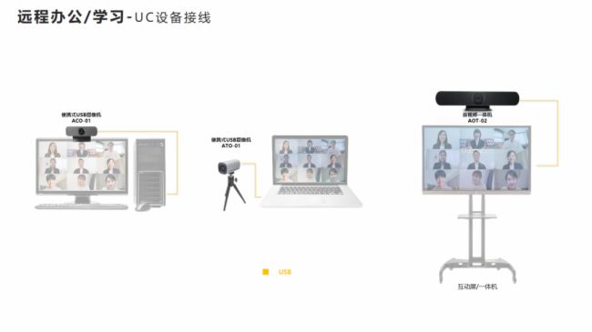 各种学习方式和办公方式的出现,就需要有相应的音视频设备协助用户。便携式USB摄像机适合中小型的书房、客厅等,其他使用场景,音视频一体机适用于大型书房、会客室等空间。设备让用户在远程连线沟通的同时,还能保证人像的清晰,使线上沟通更加亲切。