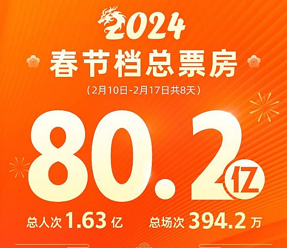 与文旅的爆、春晚的出圈不同,2024年的春节电影市场,从内容角度看“各个都不错”,但是缺少了领头的“现象级”大片。即没有2023年的《流浪地球2》、也没有2021年的《李焕英》,但是依然取得了80.2亿元(截止2月17日21时),总观影人次突破1.61亿的春节档票房新高(超过2021年的78.42亿)。