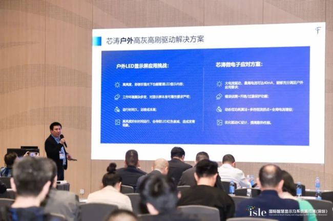 在展会开展首日,芯涛微电子受邀出席由ISLE、中国工程商联盟、《LED屏显世界》共同举办的“显示新时代与发展新思路研讨会”,与行业专家学者共同探讨新时代条件下LED显示技术的市场发展趋势。芯涛微电子研发总监黄新代表公司做了《LED驱动IC高刷高灰显示应用方案浅析》 的主题演讲。