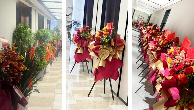 走道内外,夹道相迎的祝福花篮,是各方伙伴对东方中原安徽分公司满满的祝福与期待,同时也为公司新址增添了扑面而来的喜庆氛围。