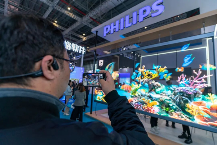 展会上,飞利浦商显特设透明OLED和全息LED屏显展区,全方位展示前沿屏显技术在零售行业的广泛应用和独特价值。55"OLED展示柜,可实现双屏互动,保障门店视野开阔,呈现科技美学;轻薄透亮、色彩绚丽的透明OLED商品陈列柜,全面焕新产品展陈方式,提升高端零售门店的艺术美感;30"触摸透明OLED展示柜既可清透显示,又能互动触摸,彰显珠宝奢华质感,提升门店客户数字体验感;全息透明LED Wall,轻薄美观,吸睛夺目,全面提升门店影响力。