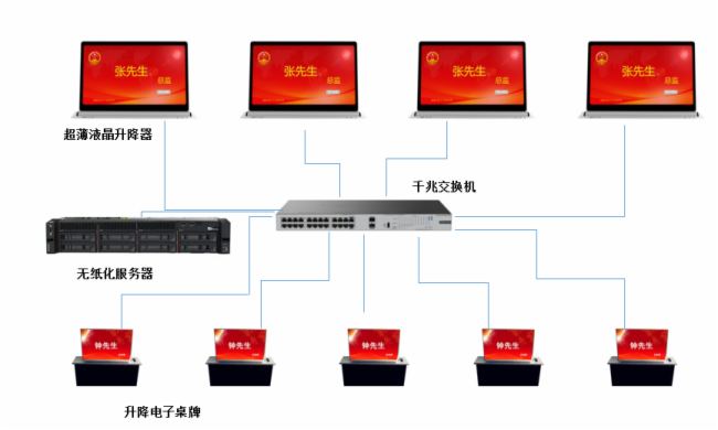 ●在每个座位配置一台无纸化会议终端;由一台控制主机来控制和管理,实现智能交互式无纸化会议系统功能;配置一台流媒体服务器,用于无纸化会议系统外部高清视频信号输入和视频信号同步输出的同步、异步处理转换处理,实现无纸化会议系统与其他视频设备的无缝对接;工作人员配置一套无纸化会议系统服务APP软件,方便工作人员看到服务请求,及时提供会议服务。