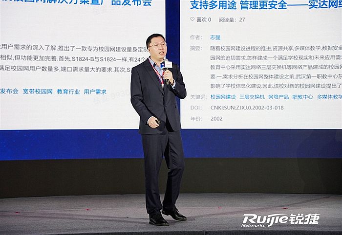 锐捷网络教育系统部总经理马雪峰发表了题为《场景创新,组织变革赋能新教育》的主题报告。他表示,与教育信息化同行20余载,锐捷“居之无倦,行之以忠”。为了帮助教育用户实现数字化转型,紧密跟随用户的发展要求,2024年,锐捷进行了组织变革,成立教育系统部,围绕全生命周期的客户体验管理(CXLM),致力于做好三件事:一是理解客户做好产品和服务,二是打造教育行业的核心渠道体系,三是紧跟趋势,创新生意模式,打造超预期的客户体验。