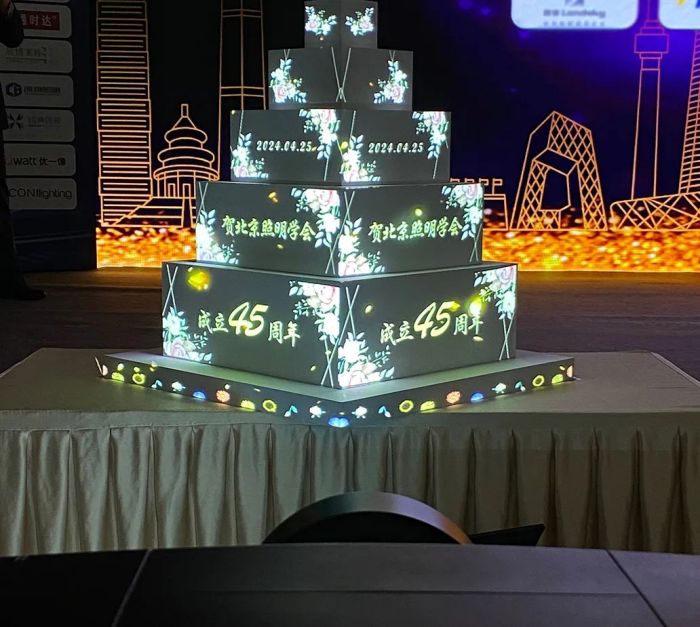 在北京照明学会成立四十五周年庆典晚会上,高端旗舰产品韦伯系列为与会来宾绘制了一场别开生面的3D Mapping生日惊喜秀,冉冉点亮“光影生日蛋糕”,将视觉冲击感拉满,晚宴气氛也被推向了新高潮。