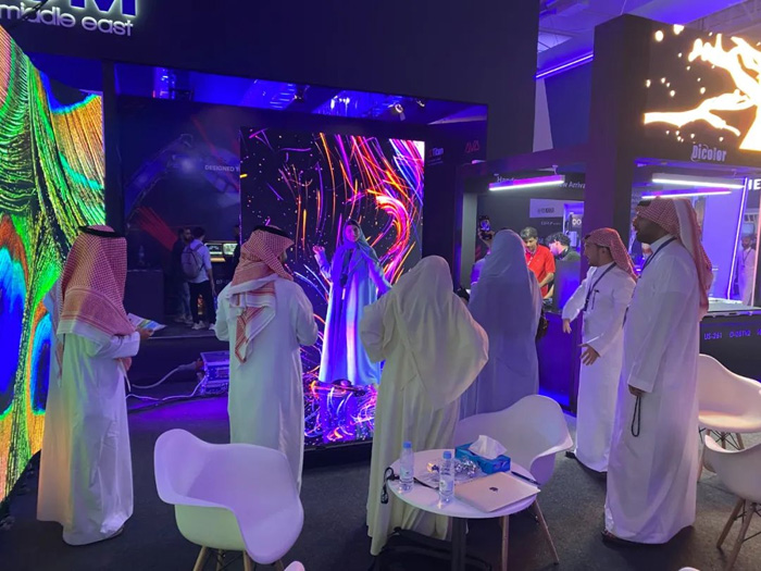 在本届沙特灯光音响展上,深德彩凭借其创新的LED显示屏产品和尖端技术,成功吸引了众多专业观众的目光。我们的展位成为了交流的中心,吸引了大量与会者前来与我们的技术专家进行深入交流,共同讨论产品特性及其在市场中的潜在优势。深德彩的创意互拼和灵活多变的造型设计,不仅引起现场观众浓厚兴趣,更获得了业界的高度评价。我们致力于推动产品创新,突破传统限制,为客户提供灵活多变的舞台组合和拼接解决方案,以满足不断变化的市场需求。未来,深德彩将继续专注于显示应用领域,紧跟客户需求和市场趋势,并不断推出创新产品,以满足更多场景的应用需求。