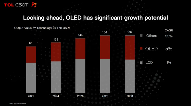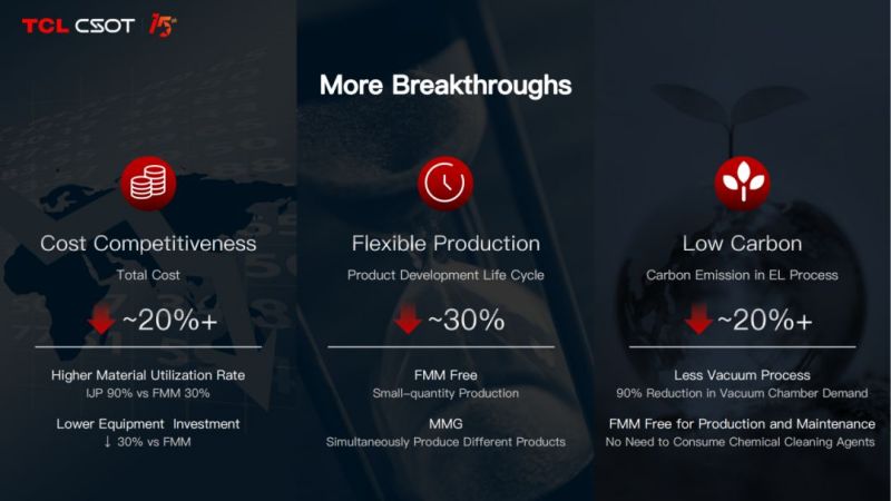画质、功耗、寿命等方面的规格激进,也有力地推动TCL华星印刷OLED技术达到应用水准,在成本、投资、适应性生产、低碳等方面拥有竞争优势。