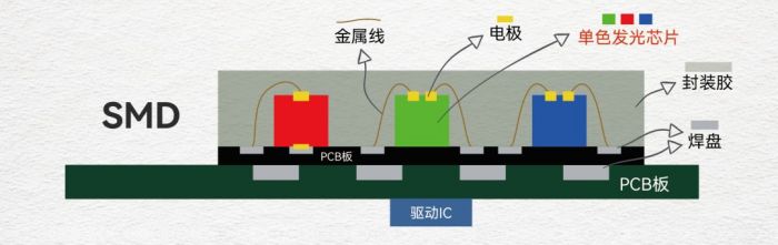 SMD技术需要封装厂先将RGB(红绿蓝)三色LED芯片封装成灯珠,再由模组厂把灯珠通过SMT贴片到PCB板上做成LED显示模组(见下图)。