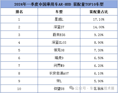 2024年一季度,自主品牌车型在AR-HUD装配量上表现突出,排名前十的均为国产车。其中,星越L、深蓝S7和蔚来ES6这三款车的装配量合计超过了整体市场的40%。