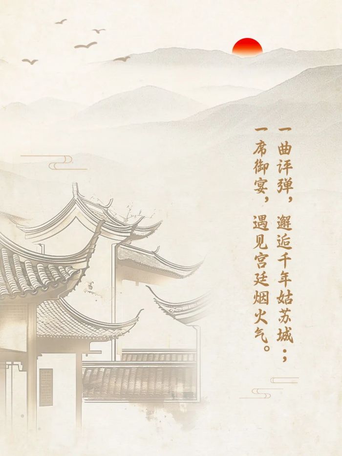 作为苏州首家沉浸式“游+宴”主题餐厅,吴宫御宴在设计细节上倾注巧思,力图构建彰显地域特色的光影空间。框景成画,苏派建筑在两侧被展览式再现,蕴藏着姑苏独有的古城韵味;楚舞吴歌,殿内亦有投影为宴席增添光彩,可谓是“入目皆风景”。