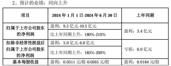 德豪润达预计2024年上半年净利润亏损3,200万元–4,200万元,上年同期亏损13,335.88 万元,比上年同期减亏68.51%至76.00%;扣非净利润亏损 3,800万元–4,800万元 ,上年同期亏损亏损13,447.24 万元 ,比上年同期比上年同期减亏64.30%至71.74%。基本每股收益亏损0.0183元/股–0.0240元/股 。