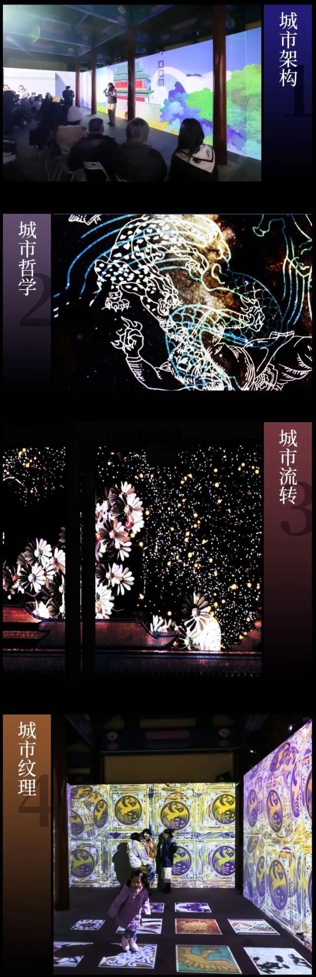 中轴线的建筑有着最顶尖的艺术探索,其惊人的纹理之美,来自数千年的美学积淀,还有几百年建城时不断的灵感创造。观众站立于心仪的纹饰之上片刻后,它将投射于四周,呈现华美的纹理世界。