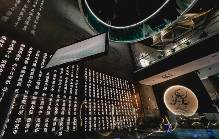 光影流动,揭开古闸的神秘面纱。复古的纹理背景墙与艺术字体、灯光相结合,营造出板闸与“水”之间的依偎之态,透出几百春秋的悠然与静谧。