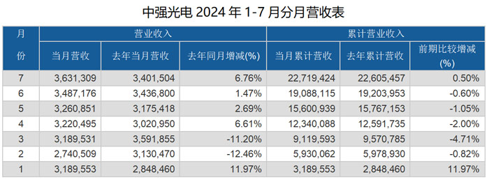 中强光电7月营收为36.31 亿新台币,同比去年同期的34.02 亿增长6.76%。1-7月累计营收为227.19亿新台币,同比去年同期的226.05亿增长0.50%。