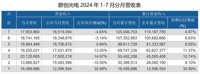 群创7月自结合并营收为新台币176.54亿元,同比去年同期的185.15亿减少4.65%。1-7月累计营收为1250.06亿新台币,同比去年同期的1191.98亿增长4.87%。群创7月大尺寸合并出货量共计904万片,较上月减少6.0%;中小尺寸合并出货量共计1,597万片,较上月减少22.5%。
