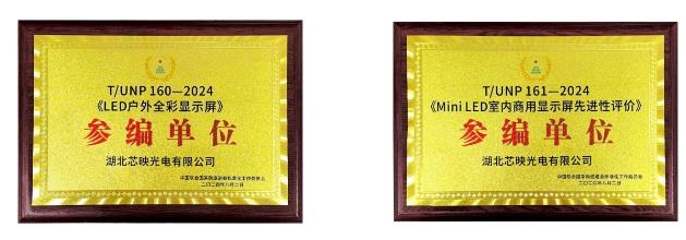 近日,由芯映光电参编起草的《LED户外全彩显示屏》、《MiniLED室内商用显示屏先进性评价》两项团体标准正式发布,将于2024年11月02日正式实施。