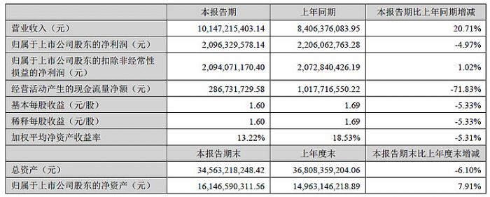 报告期内,在国内外诸多因素影响下,公司仍坚持精细化管理和高质量发展的经营理念,实现营业收入148.67亿元,比上年同期增长1.59%;归属于上市公司股东的净利润18.10亿元,比上年同期下降8.42%;实现扣除非经常性损益后的归属于上市公司股东的净利润17.62亿元,比上年同期增长0.43%。