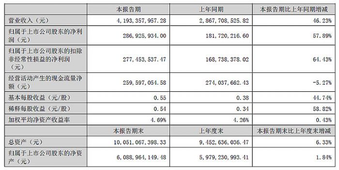 报告期内,公司实现营业收入15.63亿元,相比去年同期的13.3亿元增长17.56%,其中国内市场实现营业收入12.74亿元,较上年同期增长13.17%;海外市场实现营业收入2.89亿元,较上年同期增长41.78%;归属于上市公司股东的净利润3.24亿元,相比去年同期的2.36亿元增长37.69%。