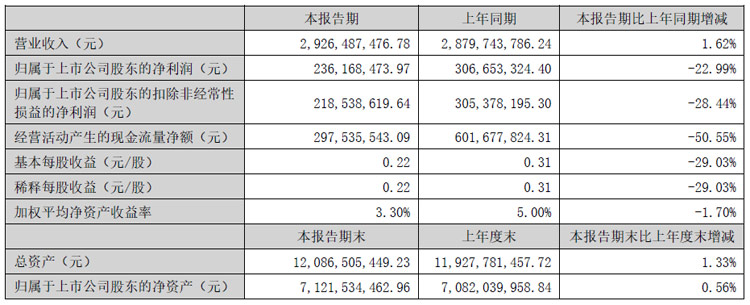 报告期内,公司实现营业收入23.96亿元,比上年同期增加11.38%;归属于上市公司股东的净利润 3.03亿元,比上年同期增长 54.59%。