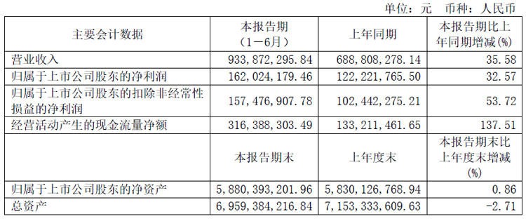 2024年上半年营业收入约6.93亿元,同比增加12.57%;归属于上市公司股东的净利润约9533万元,同比增加63.53%;基本每股收益0.55元,同比增加30.95%。