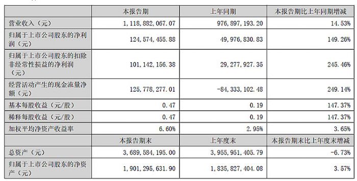 报告期内,格林达实现营业收入3.45亿元,较上年同期增长1.58%;实现归属于上市公司股东的扣除非经常性损益的净利润7604.67万元,较上年同期增长3.35%。